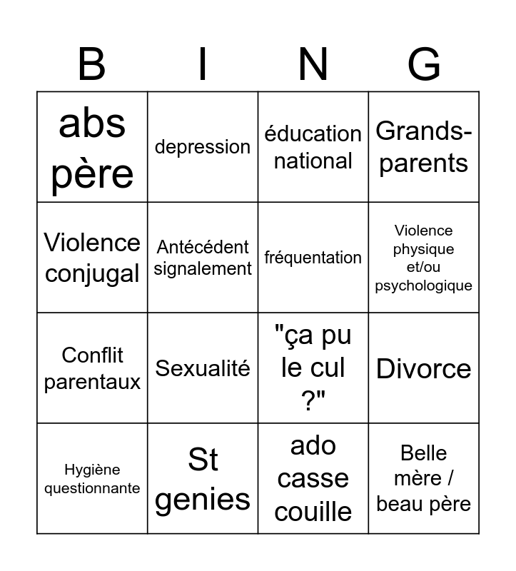 This bingo card has 16 words: St genies, Divorce, éducation national, abs père, Conflit parentaux, depression, "ça pu le cul ?", ado casse couille, Violence conjugal, Antécédent signalement, Hygiène questionnante, Grands-parents, Sexualité, Violence physique et/ou psychologique, fréquentation and Belle mère / beau père.