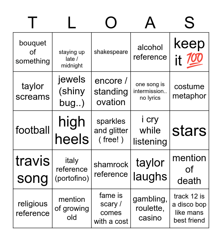 This bingo card has a free space and 24 words: italy reference (portofino), mention of growing old, encore / standing ovation, religious reference, keep it 💯, bouquet of something, taylor screams, staying up late / midnight, i cry while listening, shamrock reference, one song is intermission.. no lyrics, football, taylor laughs, mention of death, jewels (shiny bug..), gambling, roulette, casino, stars, shakespeare, costume metaphor, high heels, track 12 is a disco bop like mans best friend, travis song, alcohol reference and fame is scary / comes with a cost.