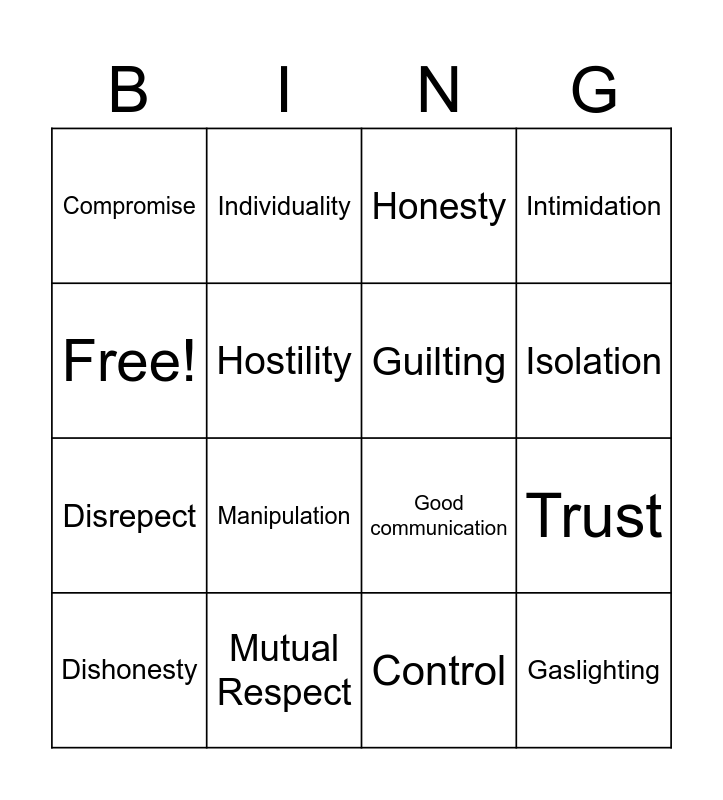 This bingo card has 16 words: Mutual Respect, Trust, Honesty, Compromise, Disrepect, Individuality, Good communication, Control, Free!, Hostility, Dishonesty, Intimidation, Manipulation, Isolation, Guilting and Gaslighting.