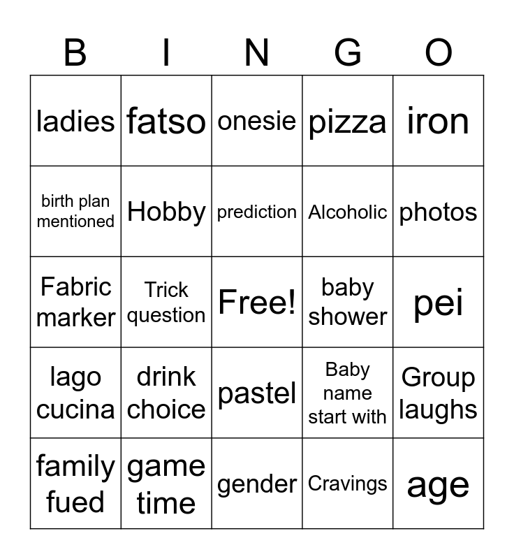 This bingo card has a free space and 24 words: drink choice, game time, prediction, family fued, iron, ladies, birth plan mentioned, fatso, baby shower, pastel, Alcoholic, Fabric marker, Baby name start with, Group laughs, Hobby, Cravings, pei, onesie, photos, Trick question, age, lago cucina, pizza and gender.