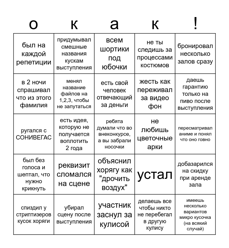 This bingo card has 25 words: реквизит сломался на сцене, участник заснул за кулисой, есть свой человек отвечающий за деньги, спиздил у стриптизеров кусок хоряги, бронировал несколько залов сразу, был на каждой репетиции, в 2 ночи спрашивал что из этого фамилия, придумывал смешные названия кускам выступления, не любишь цветочные арки, объяснил хорягу как "дрочить воздух", жесть как переживал за видео фон, ругался с СОНИВЕГАС, устал, добазарился на скидку при аренде зала, менял название файлов на 1,2,3, чтобы не запутаться, имеешь несколько вариантов микро кусочка (на всякий случай), пересматривал аниме и понял что оно говно, всем шортики под юбочки, даешь гарантию только на пиво после выступления, есть идея, которую не получается воплотить 2 года, ребята думали что во внеконкурсе, а вы забрали носочки, убирал сцену после выступления, был без голоса и шептал, что нужно крикнуть, не ты следишь за процессами костюмов and делаешь все чтобы никто не перебегал в другую кулису.