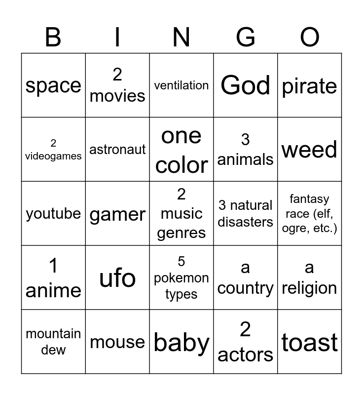 This bingo card has a free space and 24 words: ufo, mouse, one color, mountain dew, pirate, space, 2 videogames, 2 movies, 3 natural disasters, 5 pokemon types, 3 animals, youtube, a country, a religion, astronaut, 2 actors, fantasy race (elf, ogre, etc.), ventilation, weed, gamer, toast, 1 anime, God and baby.