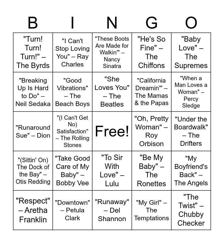 This bingo card has a free space and 49 words: "It's Now or Never" – Elvis Presley, "The Twist" – Chubby Checker, "Save the Last Dance for Me" – The Drifters, "Runaway" – Del Shannon, "Take Good Care of My Baby" – Bobby Vee, "Will You Love Me Tomorrow" – The Shirelles, "I Can't Stop Loving You" – Ray Charles, "Sherry" – The Four Seasons, "Breaking Up Is Hard to Do" – Neil Sedaka, "The Loco-Motion" – Little Eva, "Good Vibrations" – The Beach Boys, "He's So Fine" – The Chiffons, "My Boyfriend's Back" – The Angels, "Be My Baby" – The Ronettes, "Walk Like a Man" – The Four Seasons, "I Want to Hold Your Hand" – The Beatles, "She Loves You" – The Beatles, "Oh, Pretty Woman" – Roy Orbison, "Hello, Dolly!" – Louis Armstrong, "Baby Love" – The Supremes, "(I Can't Get No) Satisfaction" – The Rolling Stones, "My Girl" – The Temptations, "Turn! Turn! Turn!" – The Byrds, "California Dreamin'" – The Mamas & the Papas, "Reach Out I'll Be There" – The Four Tops, "When a Man Loves a Woman" – Percy Sledge, "Respect" – Aretha Franklin, "Light My Fire" – The Doors, "To Sir With Love" – Lulu, "(Sittin' On) The Dock of the Bay" – Otis Redding, "Mrs. Robinson" – Simon & Garfunkel, "I Heard It Through the Grapevine" – Marvin Gaye, "Aquarius/Let the Sunshine In" – The 5th Dimension, "Blowin' in the Wind" – Bob Dylan, "Downtown" – Petula Clark, "Sunshine of Your Love" – Cream, "Unchained Melody" – The Righteous Brothers, "Daydream Believer" – The Monkees, "Under the Boardwalk" – The Drifters, "Build Me Up Buttercup" – The Foundations, "Proud Mary" – Creedence Clearwater Revival, "Dancing in the Street" – Martha and the Vandellas, "Stand by Me" – Ben E. King, "Ain't No Mountain High Enough" – Marvin Gaye & Tammi Terrell, "Runaround Sue" – Dion, "These Boots Are Made for Walkin'" – Nancy Sinatra, "Hit the Road Jack" – Ray Charles, "Pretty Woman" – Roy Orbison and "Sweet Caroline" – Neil Diamond.