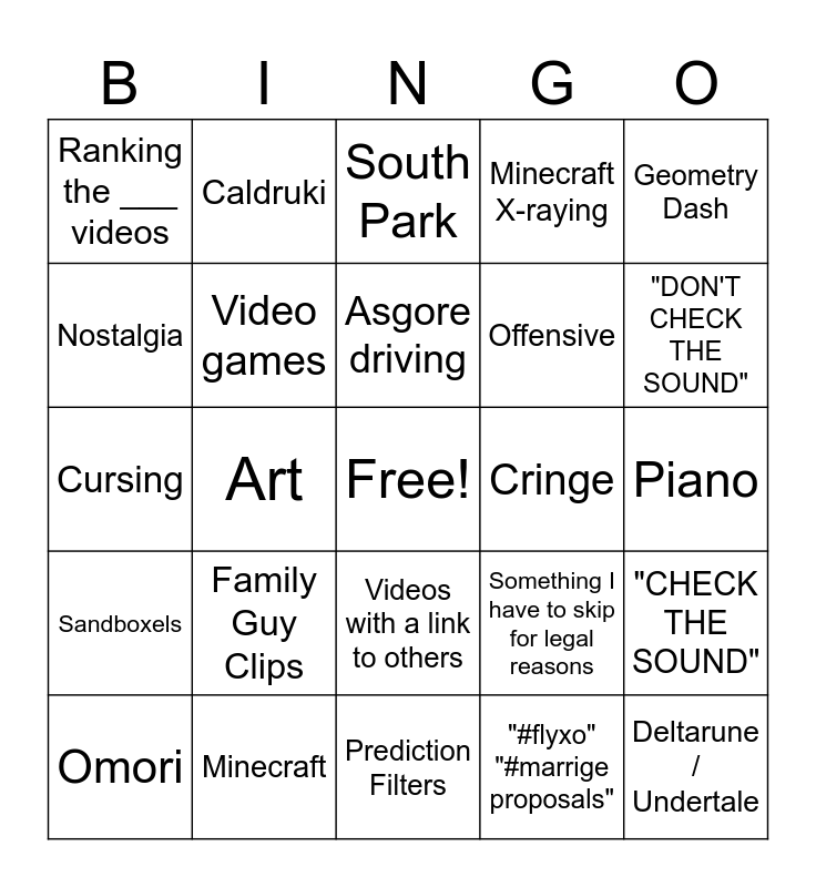 This bingo card has a free space and 24 words: Family Guy Clips, Minecraft, Asgore driving, Omori, Geometry Dash, Ranking the ___ videos, Nostalgia, Caldruki, Cringe, Videos with a link to others, Offensive, Cursing, Something I have to skip for legal reasons, "CHECK THE SOUND", Video games, "#flyxo" "#marrige proposals", Piano, South Park, "DON'T CHECK THE SOUND", Art, Deltarune / Undertale, Sandboxels, Minecraft X-raying and Prediction Filters.