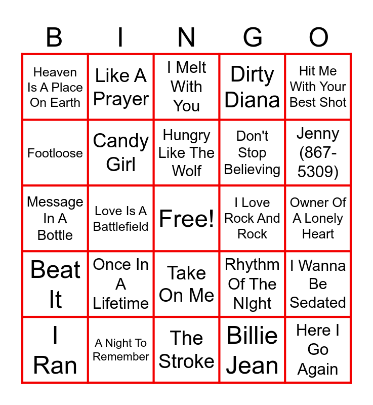 This bingo card has a free space and 60 words: A Little Bit Of Love, A Night To Remember, Any Way You Want It, Beat It, Billie Jean, Burning Down The House, Candy Girl, Wanted Dead Or Alive, Don't Stop Believing, Don't You Want Me, Dirty Diana, Eye Of The Tiger, Footloose, Free Falling, Girls Just Want To Have Fun, Heaven Is A Place On Earth, Here I Go Again, Hit Me With Your Best Shot, How Will I Know, Hungry Like The Wolf, I Love Rock And Rock, I Melt With You, I Ran, I Wanna Be Sedated, I Wanna Dance With Somebody, I Wanna Rock, I'm Gonna Be (500 Miles), Into The Groove, Jenny (867-5309), Jessie's Girl, Jump Around, La Bamba, Let The Music Play, Let's Dance, Like A Prayer, Like A Virgin, Livin' On A Prayer, Love Is A Battlefield, Love Shack, Message In A Bottle, No Sleep Til Brooklyn, Once In A Lifetime, Owner Of A Lonely Heart, Relax, Rhythm Of The NIght, Rock The Casbah, Roxanne, Summer Of 69, Tainted Love, Take On Me, The Stroke, Tom's Diner, Upside Down, Walk Like An Egyptian, We Got The Beat, We're Not Gonna Take It, Whip It, Won't Back Down, You Give Love A Bad Name and In Your Eyes.