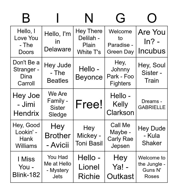 This bingo card has a free space and 24 words: Hey Brother - Avicii, You Had Me at Hello - Mystery Jets, Hello - Beyonce, I Miss You - Blink-182, Are You In? - Incubus, Hello, I Love You - The Doors, Don't Be a Stranger - Dina Carroll, Hello, I'm in Delaware, Hello - Kelly Clarkson, Hey Mickey - Toni Basil, Hey, Johnny Park - Foo Fighters, Hey Joe - Jimi Hendrix, Call Me Maybe - Carly Rae Jepsen, Hey Dude - Kula Shaker, Hey Jude - The Beatles, Hey Ya! - Outkast, Dreams - GABRIELLE, Hey There Delilah - Plain White T's, Hey, Soul Sister - Train, We Are Family - Sister Sledge, Welcome to the Jungle - Guns N' Roses, Hey, Good Lookin' - Hank Williams, Welcome to Paradise - Green Day and Hello - Lionel Richie.
