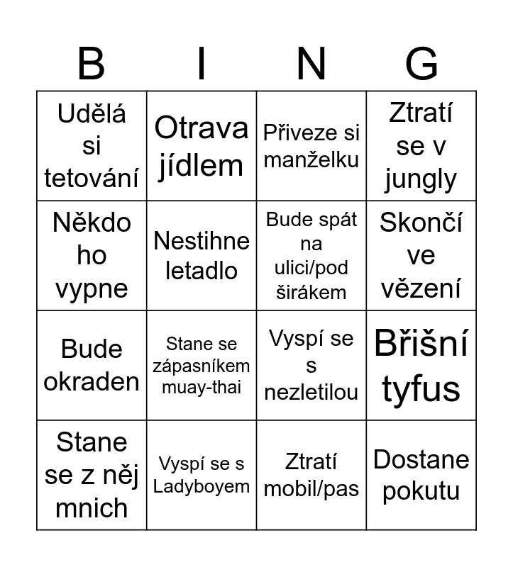 This bingo card has 16 words: Vyspí se s Ladyboyem, Břišní tyfus, Přiveze si manželku, Udělá si tetování, Bude okraden, Otrava jídlem, Vyspí se s nezletilou, Ztratí mobil/pas, Někdo ho vypne, Nestihne letadlo, Stane se z něj mnich, Ztratí se v jungly, Stane se zápasníkem muay-thai, Skončí ve vězení, Bude spát na ulici/pod širákem and Dostane pokutu.