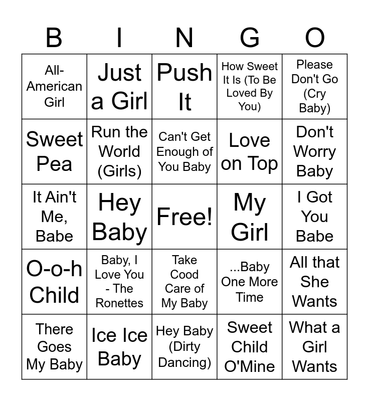 This bingo card has a free space and 33 words: Always Be My Baby, Baby Baby, Hey Baby, Baby I need Your Loving, O-o-h Child, Run the World (Girls), Please Don't Go (Cry Baby), There Goes My Baby, Just a Girl, Baby, Can't Get Enough of You Baby, Push It, Baby It's You, Baby, I Love You - Aretha Franklin, My Girl, Don't Worry Baby, Ice Ice Baby, It Ain't Me, Babe, Baby, I Love You - The Ronettes, ...Baby One More Time, Take Cood Care of My Baby, Baby Love, All-American Girl, I Got You Babe, Hey Baby (Dirty Dancing), What a Girl Wants, How Sweet It Is (To Be Loved By You), Love on Top, Sweet Pea, All that She Wants, Haven't Met You Yet, Sweet Child O'Mine and Everybody's Trying To Be My Baby.