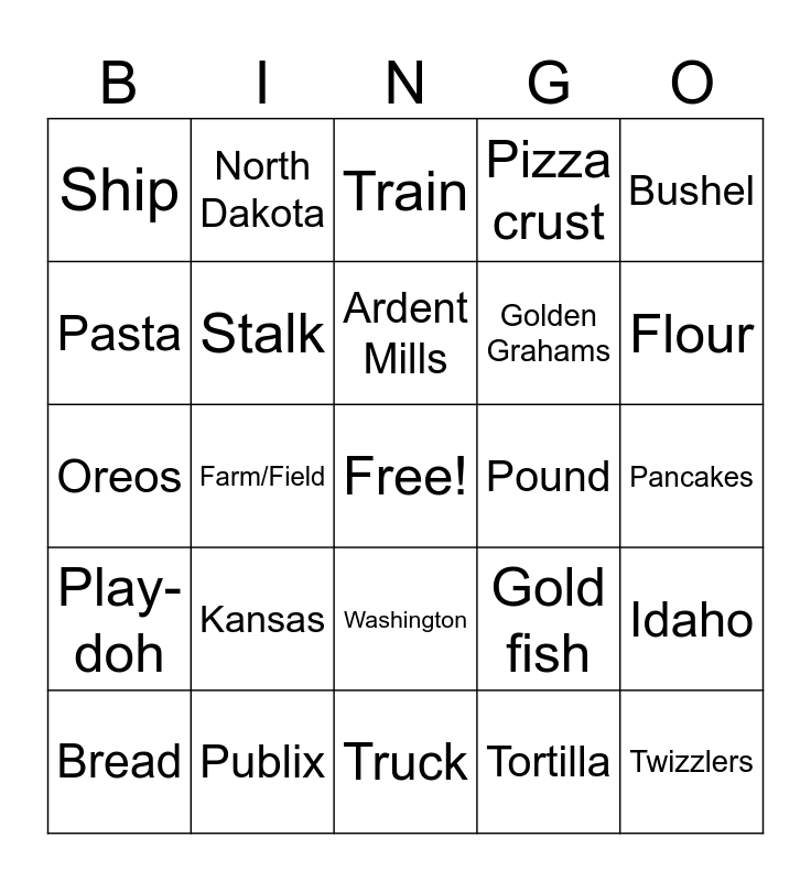 This bingo card has a free space and 24 words: Kansas, Publix, Ardent Mills, Bread, Bushel, Ship, Pasta, North Dakota, Pound, Washington, Golden Grahams, Oreos, Gold fish, Idaho, Stalk, Tortilla, Pancakes, Train, Flour, Farm/Field, Twizzlers, Play-doh, Pizza crust and Truck.