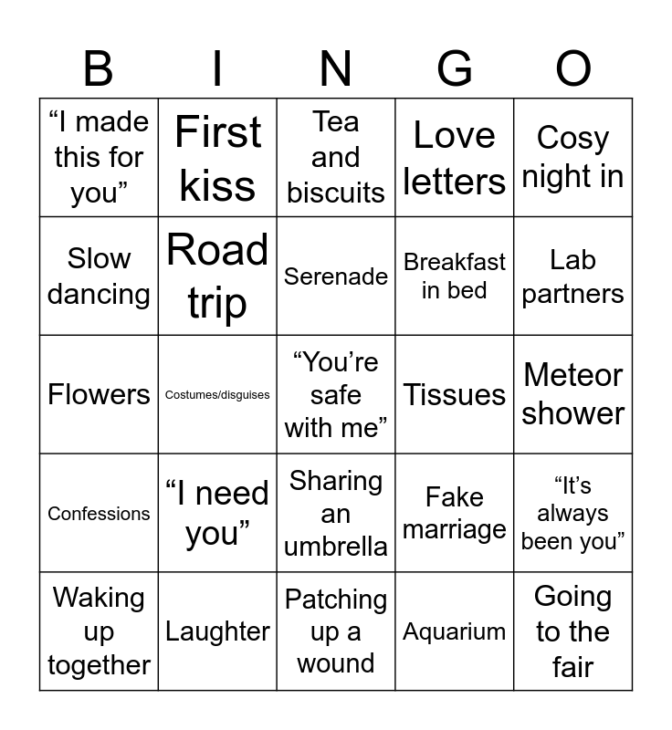 This bingo card has 30 words: Laughter, Watching the sunrise, Costumes/disguises, Solving the puzzle, “I made this for you”, Tea and biscuits, Road trip, Sharing an umbrella, Tissues, Patching up a wound, Meteor shower, “You’re safe with me”, Aquarium, Going to the fair, Lab partners, Cuddling for warmth, Fake marriage, Confessions, “I need you”, Cosy night in, Flowers, Getting caught, First kiss, Breakfast in bed, Slow dancing, Love letters, “It’s always been you”, Waking up together, Serenade and Kiss on the cheek.