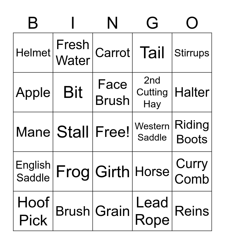 This bingo card has a free space and 27 words: Horse, 1st Cutting Hay, 2nd Cutting Hay, Grain, Apple, Carrot, Fresh Water, English Saddle, Western Saddle, Curry Comb, Mane, Tail, Hoof Pick, Brush, Halter, Bridle, Bit, Face Brush, Frog, Helmet, Riding Boots, Lead Rope, Stall, Reins, Girth, Stirrups and Irons.