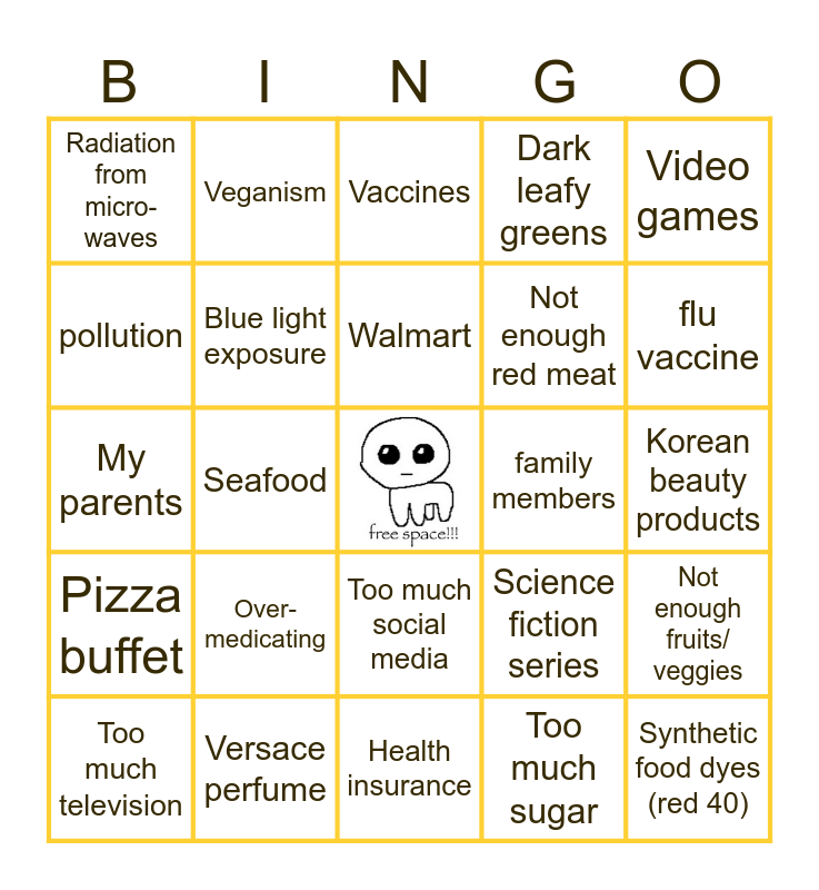 This bingo card has a free space and 24 words: Over-medicating, Versace perfume, Walmart, Too much television, Video games, Radiation from micro-waves, pollution, Veganism, family members, Too much social media, Not enough red meat, My parents, Science fiction series, Not enough fruits/ veggies, Blue light exposure, Too much sugar, Korean beauty products, Vaccines, flu vaccine, Seafood, Synthetic food dyes (red 40), Pizza buffet, Dark leafy greens and Health insurance.