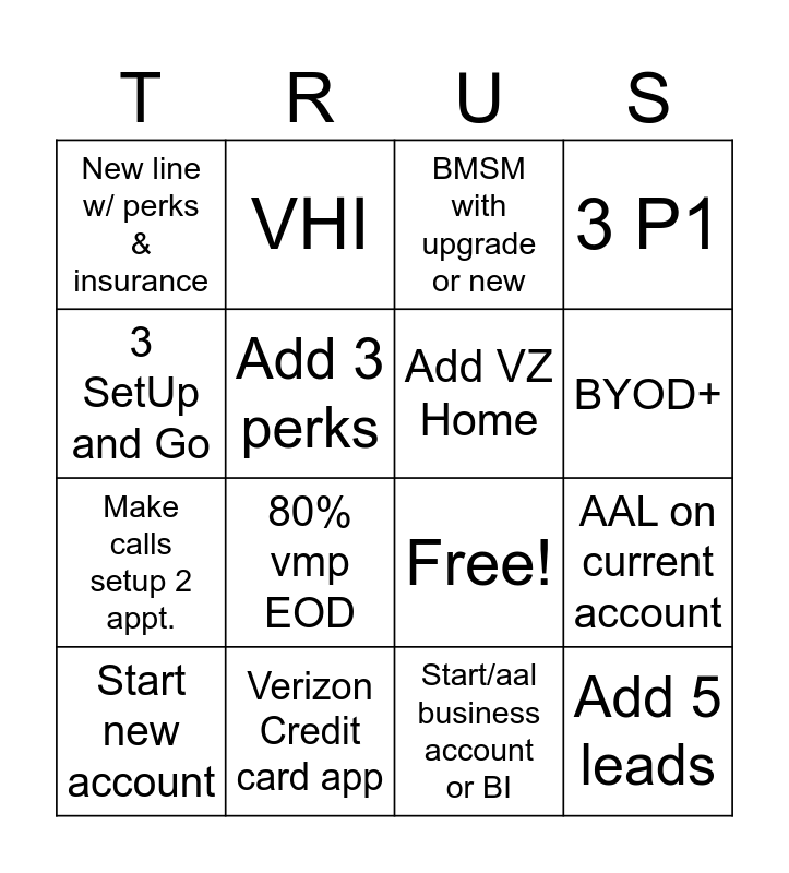 This bingo card has 16 words: Verizon Credit card app, AAL on current account, BMSM with upgrade or new, New line w/ perks & insurance, Make calls setup 2 appt., VHI, Free!, Start/aal business account or BI, 3 SetUp and Go, Add 3 perks, Start new account, 3 P1, 80% vmp EOD, BYOD+, Add VZ Home and Add 5 leads.