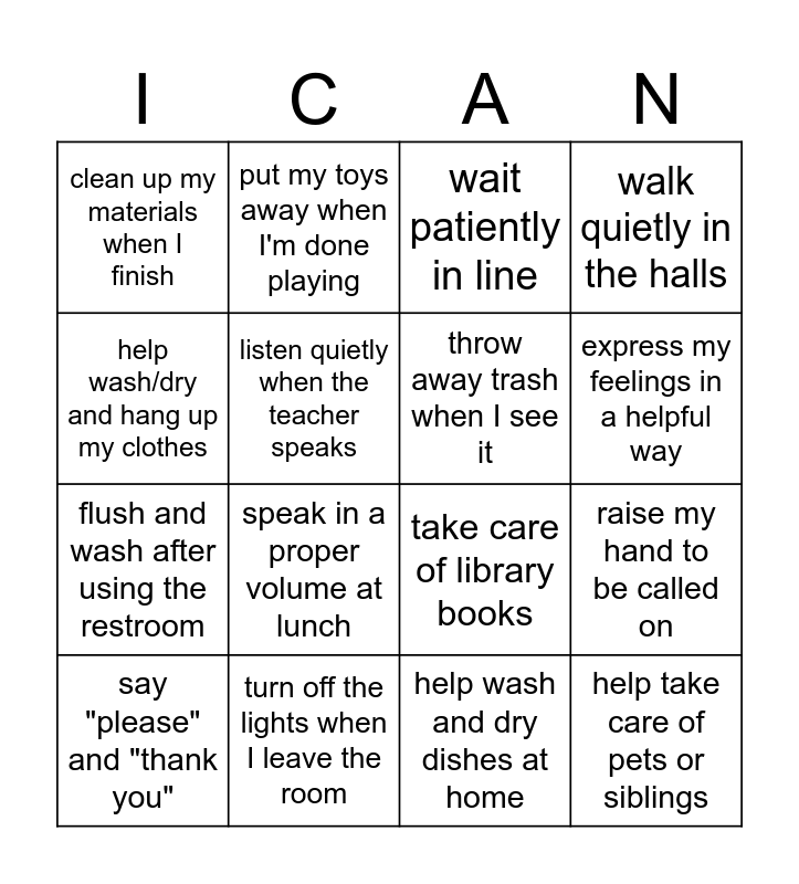 This bingo card has 16 words: turn off the lights when I leave the room, raise my hand to be called on, wait patiently in line, clean up my materials when I finish, flush and wash after using the restroom, put my toys away when I'm done playing, take care of library books, help wash and dry dishes at home, help wash/dry and hang up my clothes, listen quietly when the teacher speaks, say "please" and "thank you", walk quietly in the halls, speak in a proper volume at lunch, express my feelings in a helpful way, throw away trash when I see it and help take care of pets or siblings.