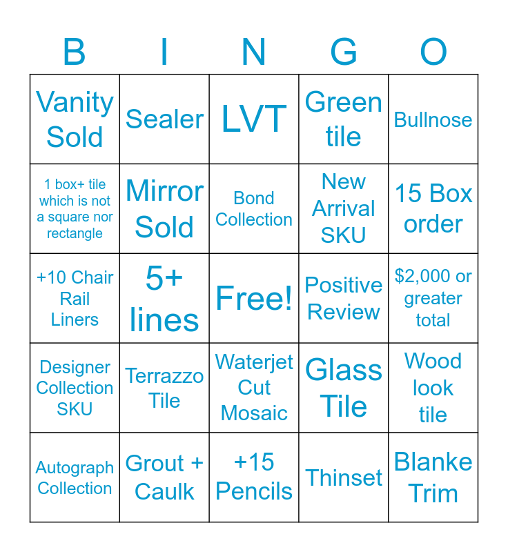 This bingo card has a free space and 30 words: Grout + Caulk, 10+ Baseboard, 5+ lines, $5,000 or greater total, Vanity Sold, LVT, Mirror Sold, Waterjet Cut Mosaic, Positive Review, +15 Pencils, $2,000 or greater total, Blanke Trim, Thinset, 24"x48" Tile, 15 Box order, Marble Field Tile, Glass Tile, Designer Collection SKU, Terrazzo Tile, Bullnose, +10 Chair Rail Liners, 1 Kit SKU, Sealer, New Arrival SKU, 1 box+ tile which is not a square nor rectangle, Green tile, Wood look tile, Autograph Collection, Bond Collection and Seaport Collection.