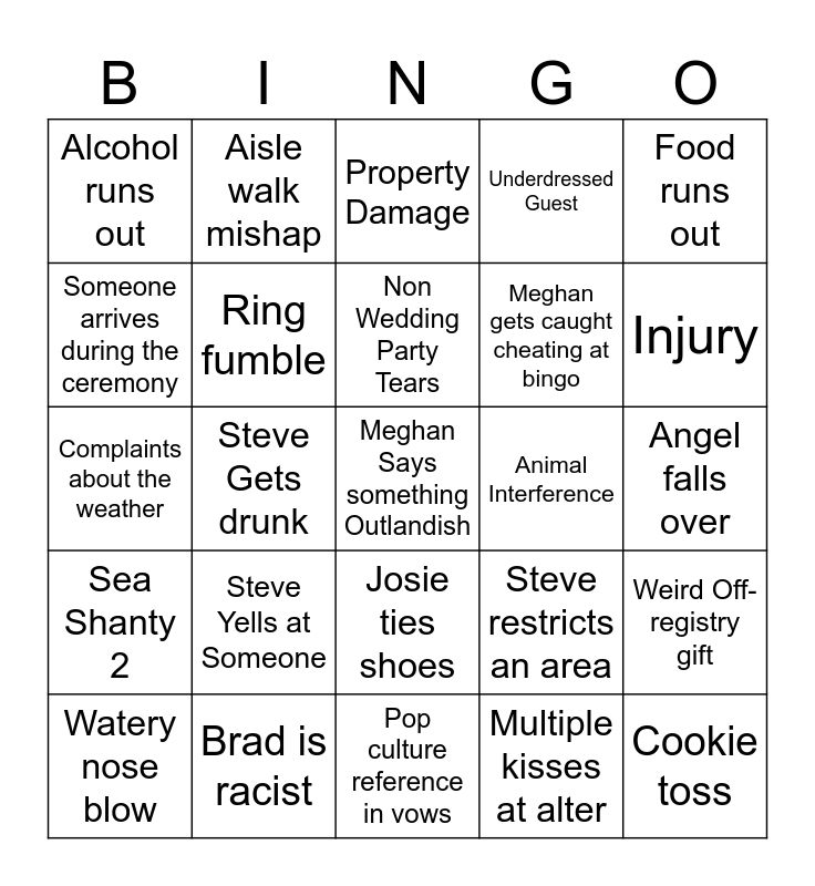 This bingo card has a free space and 24 words: Steve Yells at Someone, Brad is racist, Non Wedding Party Tears, Watery nose blow, Food runs out, Alcohol runs out, Someone arrives during the ceremony, Aisle walk mishap, Animal Interference, Josie ties shoes, Meghan gets caught cheating at bingo, Complaints about the weather, Steve restricts an area, Weird Off-registry gift, Ring fumble, Multiple kisses at alter, Angel falls over, Property Damage, Injury, Steve Gets drunk, Cookie toss, Sea Shanty 2, Underdressed Guest and Pop culture reference in vows.