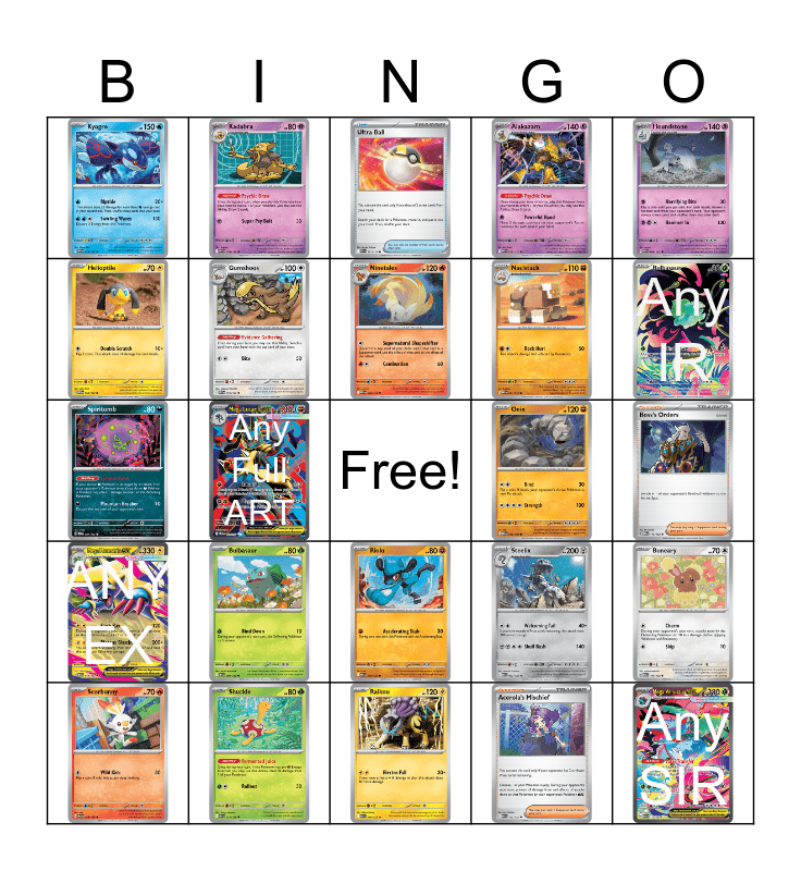 This bingo card has 24 images, a free space and 4 words: Any IR, Any Full ART, Any SIR and ANY EX.