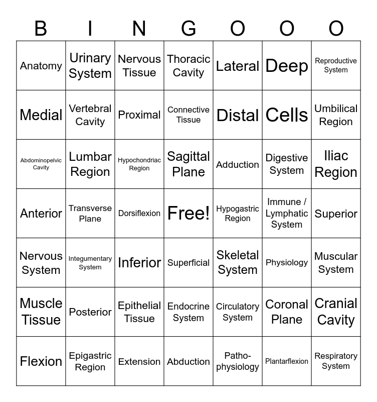 This bingo card has a free space and 48 words: Circulatory System, Cells, Abduction, Transverse Plane, Hypochondriac Region, Superior, Urinary System, Epigastric Region, Deep, Superficial, Reproductive System, Thoracic Cavity, Digestive System, Adduction, Muscle Tissue, Immune / Lymphatic System, Medial, Umbilical Region, Coronal Plane, Lateral, Distal, Dorsiflexion, Anatomy, Vertebral Cavity, Cranial Cavity, Proximal, Iliac Region, Flexion, Sagittal Plane, Lumbar Region, Plantarflexion, Hypogastric Region, Muscular System, Posterior, Anterior, Skeletal System, Physiology, Abdominopelvic Cavity, Inferior, Epithelial Tissue, Nervous System, Respiratory System, Nervous Tissue, Extension, Connective Tissue, Endocrine System, Integumentary System and Patho-physiology.