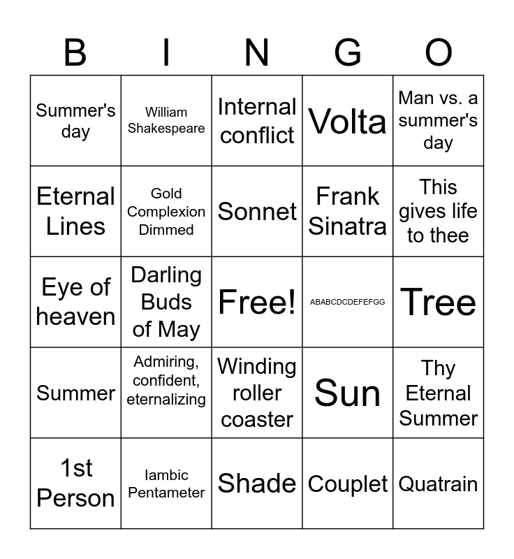 This bingo card has a free space and 24 words: Admiring, confident, eternalizing, Iambic Pentameter, Sonnet, 1st Person, Man vs. a summer's day, Summer's day, Eternal Lines, William Shakespeare, ABABCDCDEFEFGG, Winding roller coaster, Frank Sinatra, Eye of heaven, Sun, Thy Eternal Summer, Gold Complexion Dimmed, Couplet, Tree, Internal conflict, This gives life to thee, Darling Buds of May, Quatrain, Summer, Volta and Shade.