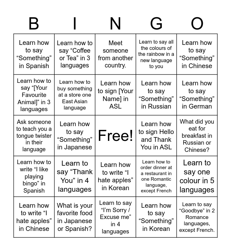 This bingo card has a free space and 49 words: Learn to say “Hello” in 2 East Asian languages., Learn to say “Goodbye” in 2 Romance languages, except French., Learn to say “Delicious” in 4 languages., Learn to say “I’m Sorry / Excuse me” in 4 languages, Learn to say “Thank You” in 4 languages, Learn to say “Good Luck” in 4 languages, Learn how to say “Coffee or Tea” in 3 languages, Learn how to say “[Your Hobby]” in 3 languages, Learn how to say “[Your Favourite Animal]” in 3 languages, Learn how to order dinner at a restaurant in one Romantic language, except French, Learn how to buy something at a store one East Asian language, Learn to say all the colours of the rainbow in a new language to you, Learn to say one colour in 5 languages, Learn how to order dinner at a restaurant in one Romantic language, except French, Learn how to buy something at a store one East Asian language, Learn how to sign “Coffee or Tea” in 3 languages, Learn how to sign [Your Name] in ASL, Learn how to sign Hello and Thank You in ASL, Learn how to sign [Your Hobby] in ASL, Learn how to say “Something” in Chinese, Learn how to say “Something” in Japanese, Learn how to say “Something” in Korean, Learn how to say “Something” in Spanish, Learn how to say “Something” in Russian, Learn how to say “Something” in Italian, Learn how to say “Something” in German, Learn how to write “I hate apples” in Chinese, Learn how to write “I hate apples” in Japanese, Learn how to write “I hate apples” in Korean, Learn how to write “I like playing bingo” in Spanish, Learn how to write “I hate apples” in Russian, Learn how to write “I hate apples” in Italian, Learn how to write “I hate apples” in German, What is your favourite colour in Chinese or German?, What is your favorite food in Japanese or Spanish?, What are you wearing today in Korean or Italian?, How did you get to this event in Russian or Japanese?, What is your year and major in Spanish or German?, What did you eat for breakfast in Russian or Chinese?, Find a book with the language your learning in the title, Find someone who can count to 10 in three languages, Solve for x in a new language to you : x + ½ + 12 = 5, Get the names of 2 conversation group partners, Get the names of 2 TAs, Ask someone to teach you a tongue twister in their language, Meet someone from another country., Meet a student in their 4th year or higher., Find someone who is a first-year student. and Find someone who has studied abroad or is an international student..