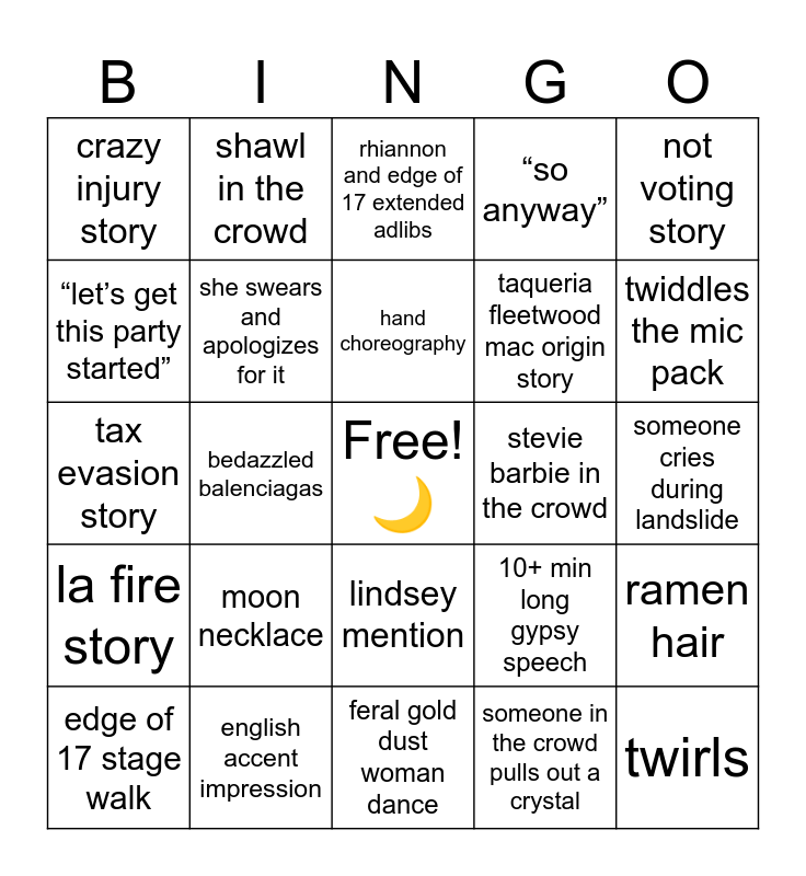 This bingo card has a free space and 24 words: moon necklace, english accent impression, hand choreography, edge of 17 stage walk, not voting story, crazy injury story, “let’s get this party started”, shawl in the crowd, stevie barbie in the crowd, lindsey mention, taqueria fleetwood mac origin story, tax evasion story, 10+ min long gypsy speech, ramen hair, she swears and apologizes for it, someone in the crowd pulls out a crystal, someone cries during landslide, rhiannon and edge of 17 extended adlibs, twiddles the mic pack, bedazzled balenciagas, twirls, la fire story, “so anyway” and feral gold dust woman dance.