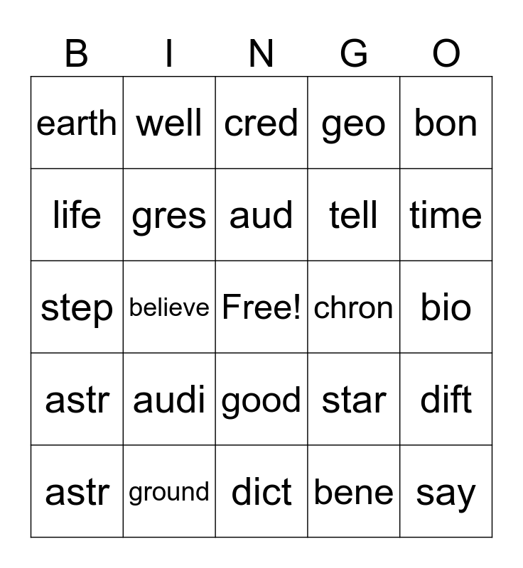 This bingo card has a free space and 24 words: astr, audi, aud, bene, bon, earth, well, cred, chron, bio, step, gres, star, dift, life, ground, dict, geo, time, astr, believe, good, tell and say.
