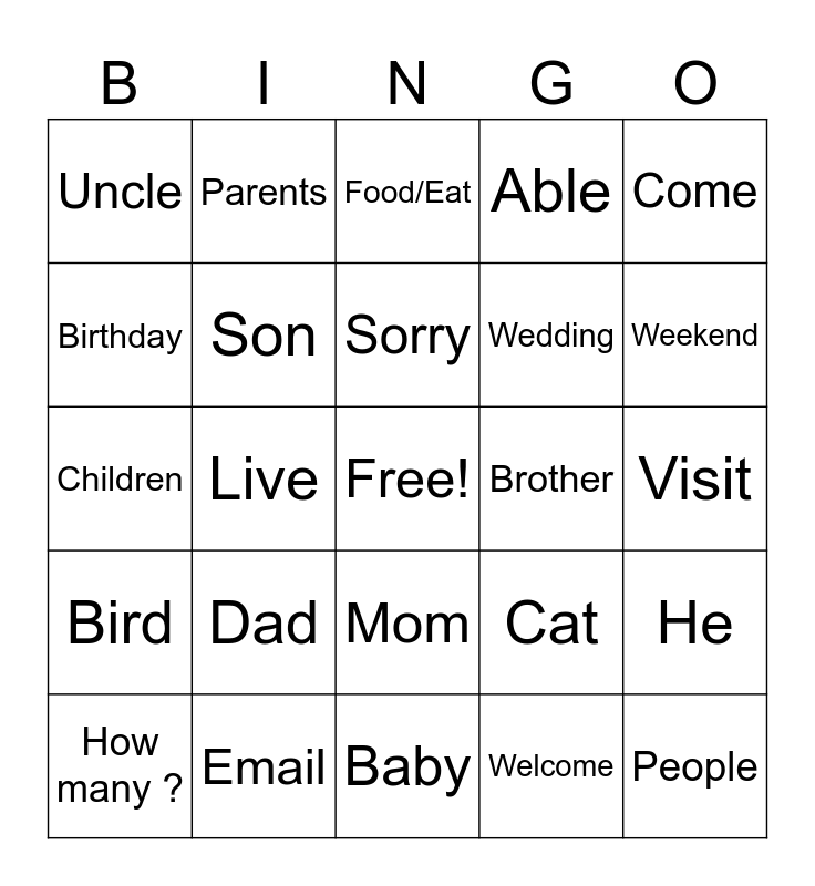 This bingo card has a free space and 44 words: Send, People, Attend, How many ?, Party, Welcome, Food/Eat, Finish, Come, Email, Able, Brother, Mom, Dad, Sister, Baby, Family, Children, My, Weekend, Parents, Aunt, Fly(as in an airplane), Uncle, Now, Visit, Recent, Dog, Cat, Bird, Fish, He, Move, Your, Live, Where?, Grandma, Grandpa, Sorry, Birthday, Wedding, Anniversary, Son and Daughter.
