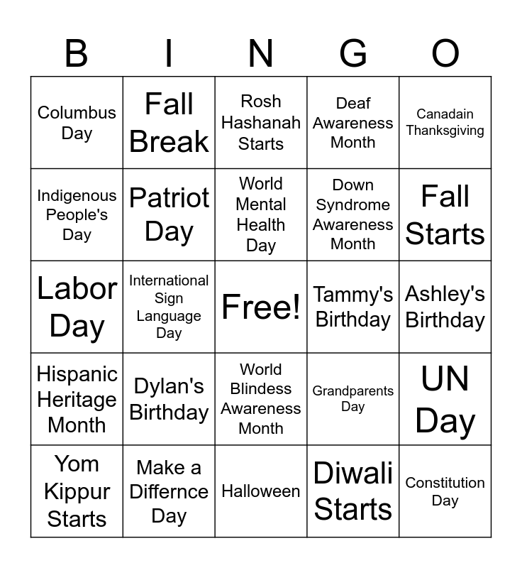 This bingo card has a free space and 24 words: Dylan's Birthday, Make a Differnce Day, World Mental Health Day, Yom Kippur Starts, Canadain Thanksgiving, Columbus Day, Indigenous People's Day, Fall Break, Tammy's Birthday, World Blindess Awareness Month, Down Syndrome Awareness Month, Labor Day, Grandparents Day, UN Day, Patriot Day, Diwali Starts, Ashley's Birthday, Rosh Hashanah Starts, Fall Starts, International Sign Language Day, Constitution Day, Hispanic Heritage Month, Deaf Awareness Month and Halloween.