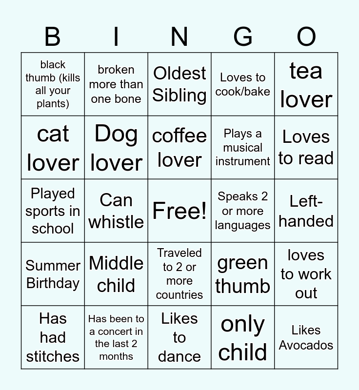 This bingo card has a free space and 24 words: Middle child, Has been to a concert in the last 2 months, coffee lover, Has had stitches, tea lover, black thumb (kills all your plants), cat lover, broken more than one bone, Speaks 2 or more languages, Traveled to 2 or more countries, Plays a musical instrument, Played sports in school, green thumb, loves to work out, Dog lover, only child, Left-handed, Oldest Sibling, Loves to read, Can whistle, Likes Avocados, Summer Birthday, Loves to cook/bake and Likes to dance.