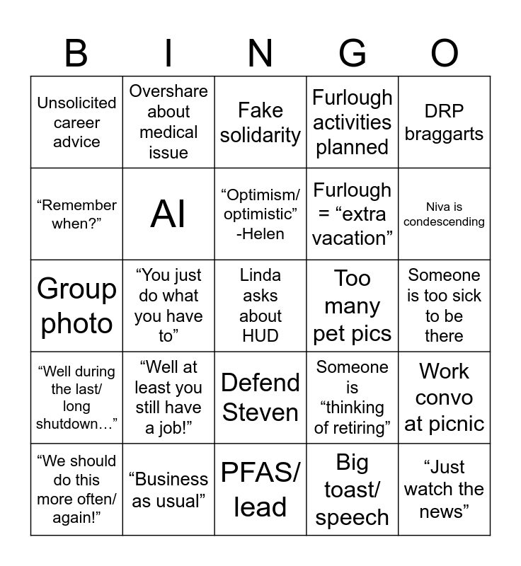This bingo card has a free space and 24 words: “Well at least you still have a job!”, “Business as usual”, “Optimism/ optimistic” -Helen, “We should do this more often/ again!”, DRP braggarts, Unsolicited career advice, “Remember when?”, Overshare about medical issue, Too many pet pics, Defend Steven, Furlough = “extra vacation”, Group photo, Someone is “thinking of retiring”, Work convo at picnic, AI, Big toast/ speech, Someone is too sick to be there, Fake solidarity, Niva is condescending, “You just do what you have to”, “Just watch the news”, “Well during the last/ long shutdown…”, Furlough activities planned and PFAS/ lead.