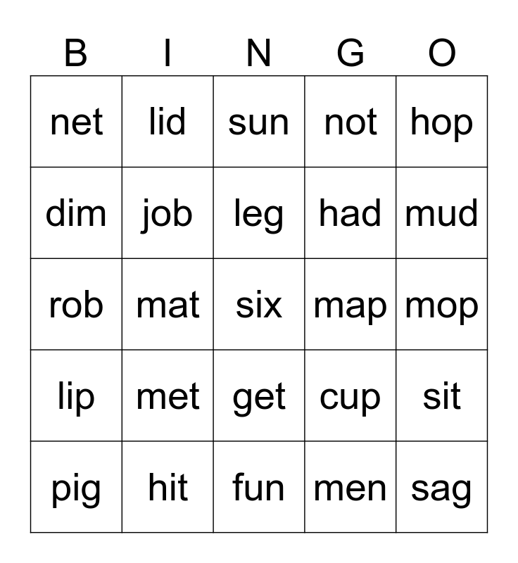 This bingo card has a free space and 24 words: met, hit, leg, pig, hop, net, dim, lid, map, get, had, rob, cup, sit, job, men, mop, sun, mud, mat, sag, lip, not and fun.