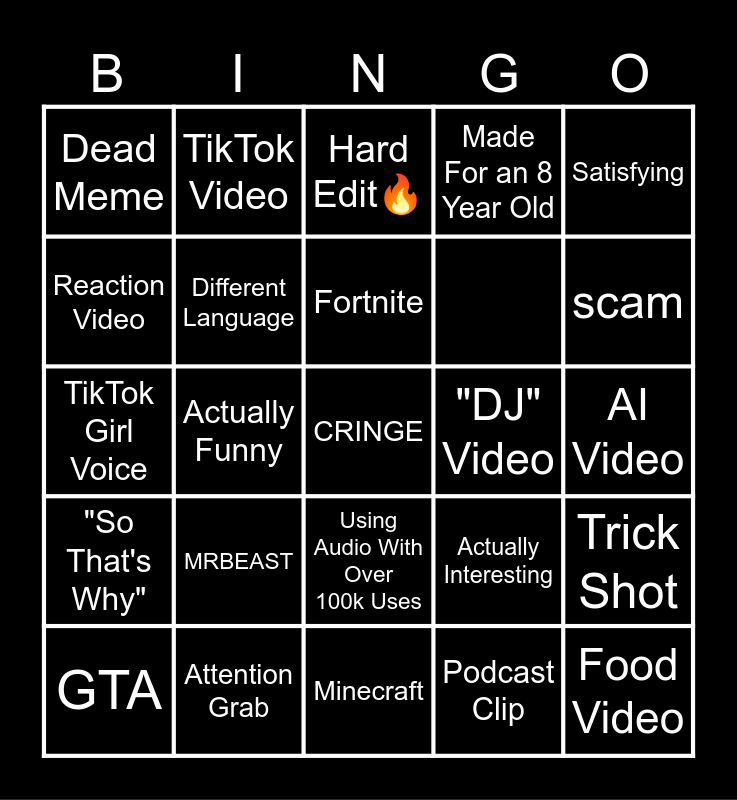 This bingo card has a free space and 24 words: MRBEAST, Attention Grab, Fortnite, GTA, Satisfying, Dead Meme, Reaction Video, TikTok Video, "DJ" Video, Using Audio With Over 100k Uses, brainrot, TikTok Girl Voice, Actually Interesting, Trick Shot, Different Language, Podcast Clip, AI Video, Hard Edit🔥, scam, Actually Funny, Food Video, "So That's Why", Made For an 8 Year Old and Minecraft.