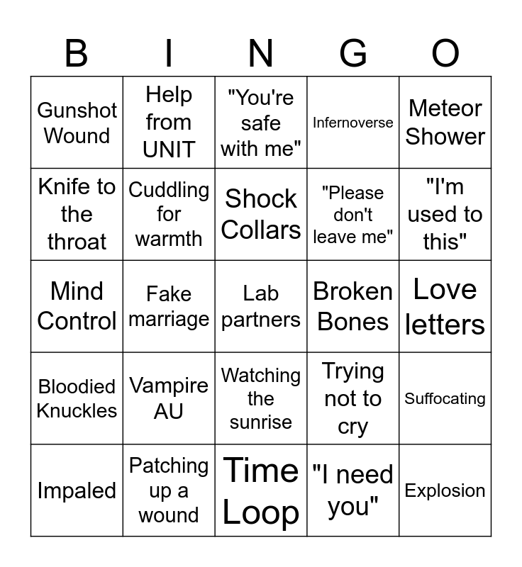 This bingo card has a free space and 24 words: Vampire AU, Patching up a wound, Shock Collars, Impaled, Meteor Shower, Gunshot Wound, Knife to the throat, Help from UNIT, Broken Bones, Watching the sunrise, "Please don't leave me", Mind Control, Trying not to cry, Suffocating, Cuddling for warmth, "I need you", Love letters, "You're safe with me", "I'm used to this", Fake marriage, Explosion, Bloodied Knuckles, Infernoverse and Time Loop.