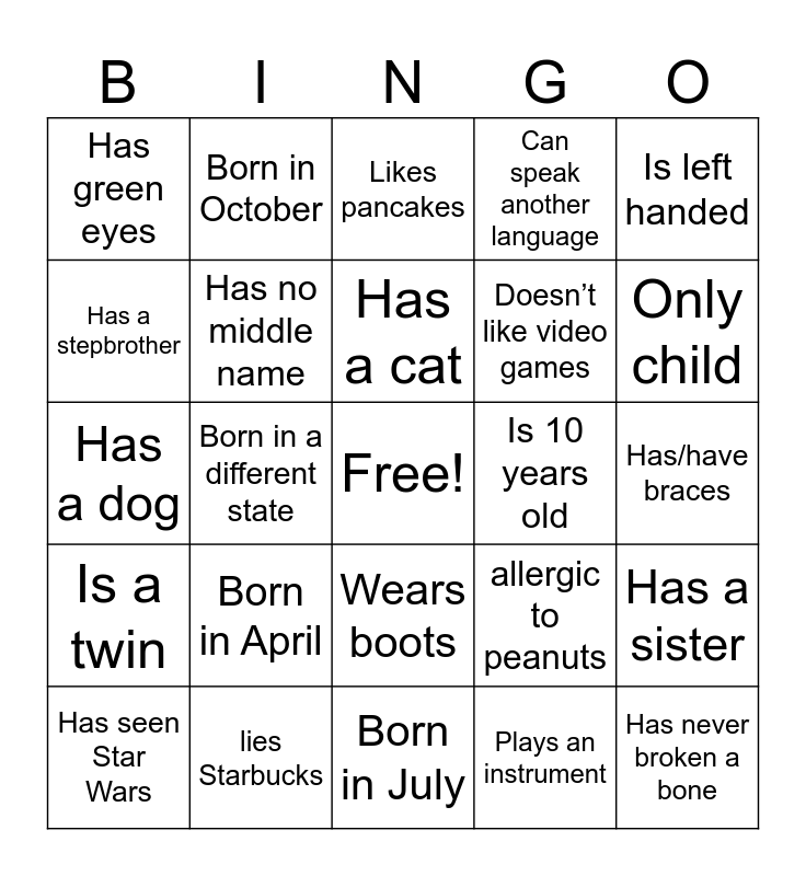 This bingo card has a free space and 24 words: Born in April, lies Starbucks, Has a cat, Has seen Star Wars, Is left handed, Has green eyes, Has a stepbrother, Born in October, Is 10 years old, Wears boots, Doesn’t like video games, Has a dog, allergic to peanuts, Has a sister, Has no middle name, Plays an instrument, Has/have braces, Likes pancakes, Only child, Born in a different state, Has never broken a bone, Is a twin, Can speak another language and Born in July.