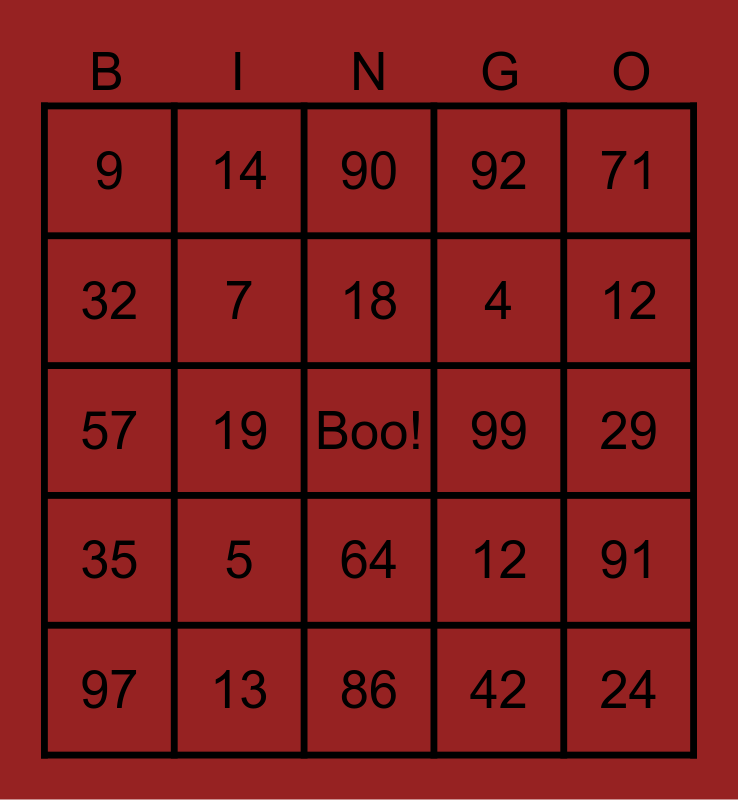 This bingo card has a free space and 24 words: 5, 13, 18, 97, 71, 9, 32, 14, 99, 64, 4, 57, 12, 91, 7, 42, 29, 90, 12, 19, 24, 35, 92 and 86.