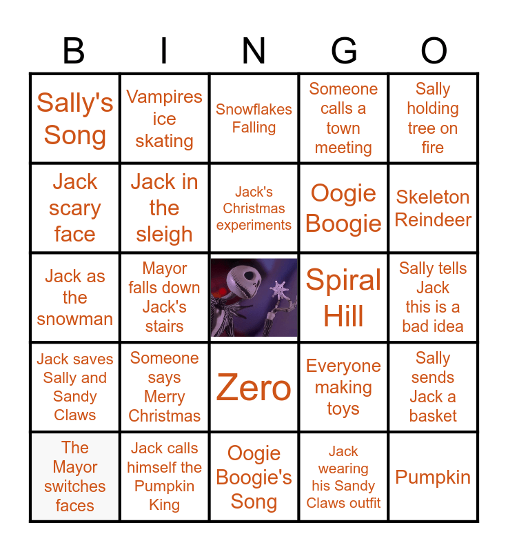 This bingo card has a free space and 29 words: The Mayor switches faces, Sally poisons Dr. Finkelstein's soup, Mayor falls down Jack's stairs, Shock, Lock, and Barrel bring Sandy Claws to Oogie Boogie, Sally's Song, Snowflakes Falling, Jack in the sleigh, Someone says Merry Christmas, Spiral Hill, Jack calls himself the Pumpkin King, Sally tells Jack this is a bad idea, Pumpkin, Oogie Boogie's Song, Jack wearing his Sandy Claws outfit, Skeleton Reindeer, Jack goes through Christmas Door, Zero, Jack saves Sally and Sandy Claws, Sally holding tree on fire, Jack as the snowman, Everyone making toys, Scary duck toy, Oogie Boogie, Jack scary face, Someone calls a town meeting, Vampires ice skating, Sally sends Jack a basket, Jack's Christmas experiments and Someone calls police station.