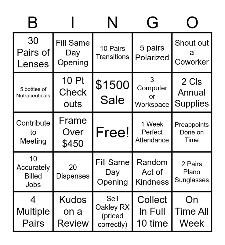 This bingo card has a free space and 29 words: 4 Multiple Pairs, Single Pair Over $800, Frame Over $450, 5 Cleaners, 30 Pairs of Lenses, 10 Pairs Transitions, 10 Pt Check outs, 20 Dispenses, 1 Week Perfect Attendance, Kudos on a Review, Preappoints Done on Time, On Time All Week, Sell Oakley RX (priced correctly), Collect In Full 10 time, 2 Cls Annual Supplies, CE Credit (1), Fill Same Day Opening, 10 Accurately Billed Jobs, Shout out a Coworker, Contribute to Meeting, Random Act of Kindness, Help Another Department, 3 Computer or Workspace, 5 bottles of Nutraceuticals, 5 pairs Polarized, Fill Same Day Opening, 2 Pairs Plano Sunglasses, $1500 Sale and 3 Pairs Maui Jim.