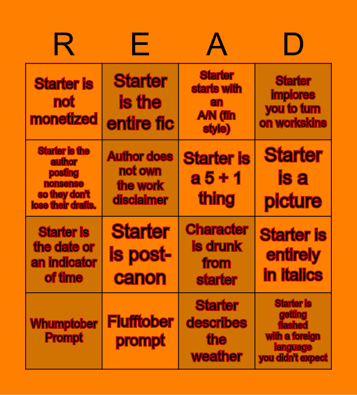 This bingo card has 16 words: Whumptober Prompt, Flufftober prompt, Starter starts with an A/N (ffn style), Starter implores you to turn on workskins, Starter is the author posting nonsense so they don't lose their drafts., Starter is the entire fic, Character is drunk from starter, Starter is entirely in italics, Starter is not monetized, Author does not own the work disclaimer, Starter describes the weather, Starter is a picture, Starter is the date or an indicator of time, Starter is post-canon, Starter is a 5 + 1 thing and Starter is getting flashed with a foreign language you didn't expect.