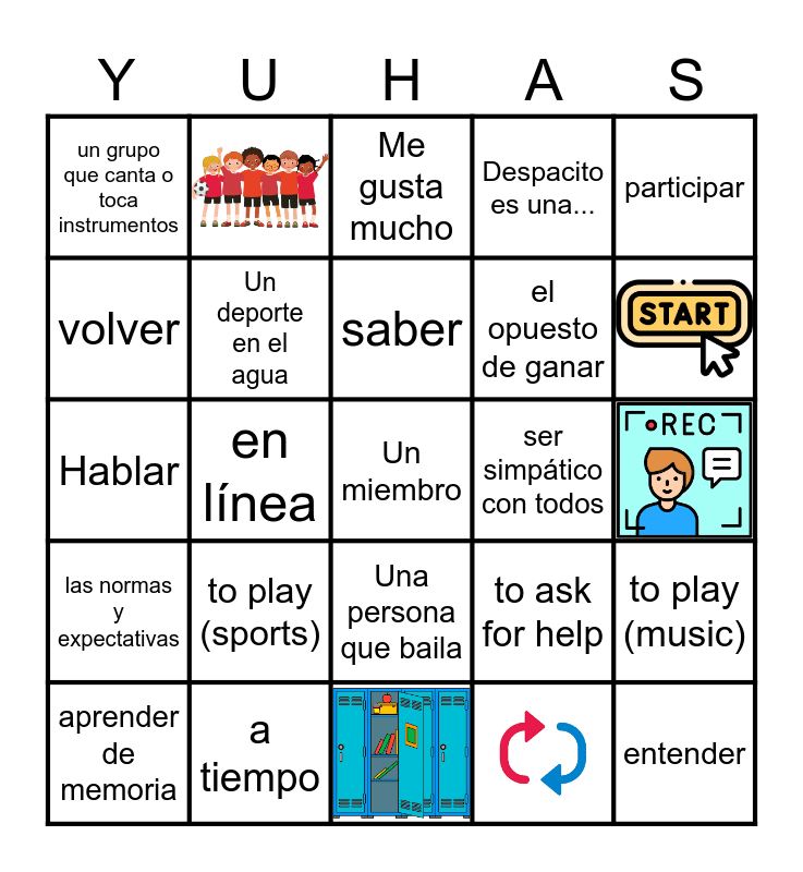 This bingo card has 5 images and 20 words: to play (sports), saber, aprender de memoria, participar, un grupo que canta o toca instrumentos, volver, ser simpático con todos, Una persona que baila, el opuesto de ganar, Hablar, to ask for help, to play (music), Un deporte en el agua, entender, Me gusta mucho, en línea, Un miembro, a tiempo, las normas y expectativas and Despacito es una....