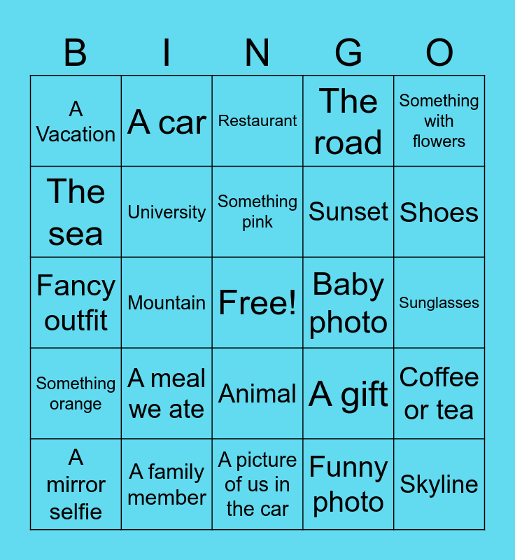This bingo card has a free space and 24 words: A meal we ate, A family member, Something pink, A mirror selfie, Something with flowers, A Vacation, The sea, A car, Baby photo, Animal, Sunset, Fancy outfit, A gift, Coffee or tea, University, Funny photo, Sunglasses, Restaurant, Shoes, Mountain, Skyline, Something orange, The road and A picture of us in the car.