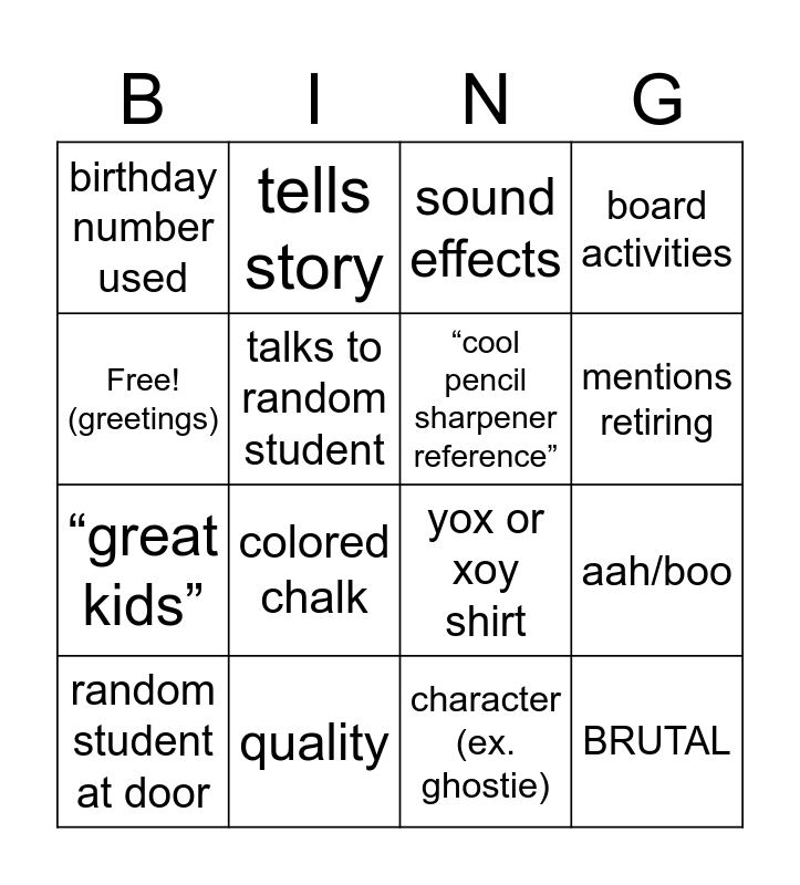 This bingo card has 16 words: quality, aah/boo, sound effects, birthday number used, “great kids”, tells story, yox or xoy shirt, character (ex. ghostie), Free! (greetings), talks to random student, random student at door, board activities, colored chalk, mentions retiring, “cool pencil sharpener reference” and BRUTAL.