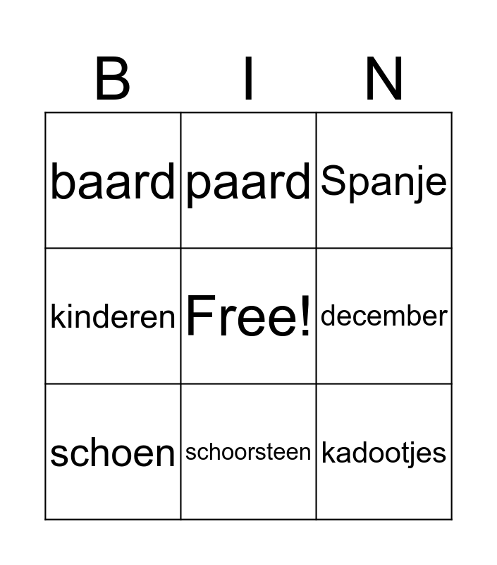 This bingo card has a free space and 8 words: december, Spanje, paard, schoen, baard, kadootjes, kinderen and schoorsteen.