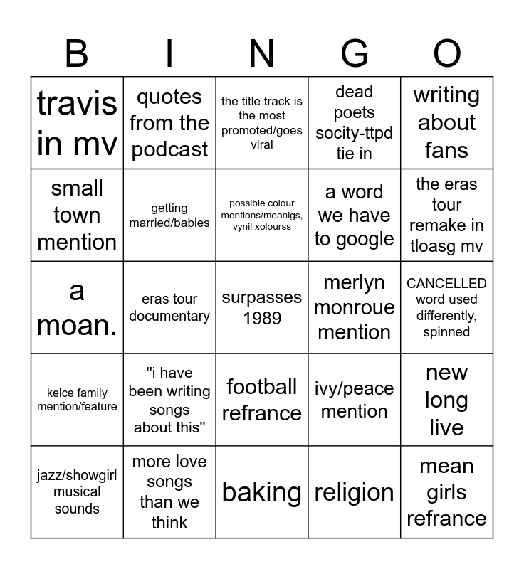 This bingo card has 1 images and 35 words: white wine/alcohol, the prophecy full circle, ovulation song, getting married/babies, ivy/peace mention, kelce family mention/feature, possible colour mentions/meanigs, vynil xolourss, ex comparioson, writing about fans, popular place named, eras tour documentary, dead poets socity-ttpd tie in, evely hugo mention, merlyn monroue mention, the eras tour remake in tloasg mv, travis in mv, mean girls refrance, ''i have been writing songs about this'', surpasses 1989, the title track is the most promoted/goes viral, CANCELLED word used differently, spinned, new long live, more love songs than we think, jazz/showgirl musical sounds, baking, quotes from the podcast, a moan., a lyric makes us cry, a word we have to google, small town mention, car/bar rhyme, britney spears refrance, religion, football refrance and a very famous book.