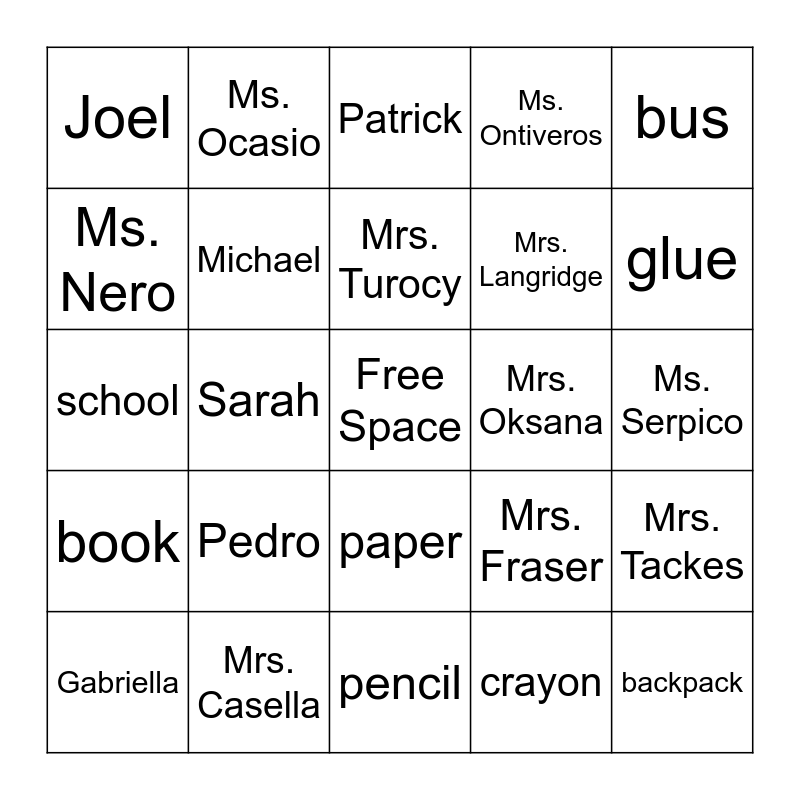 This bingo card has a free space and 29 words: Gabriella, Camila, Sarah, Liam, Joel, Patrick, Michael, Pedro, Mrs. Oksana, Mrs. Casella, Ms. Serpico, backpack, pencil, crayon, glue, scissors, paper, book, bus, school, Mrs. Fraser, Mr. Golden, Mrs. Langridge, Ms. Nero, Ms. Ontiveros, Ms. Ocasio, Mrs. Tackes, Mrs. Turocy and Mr. Soulias.