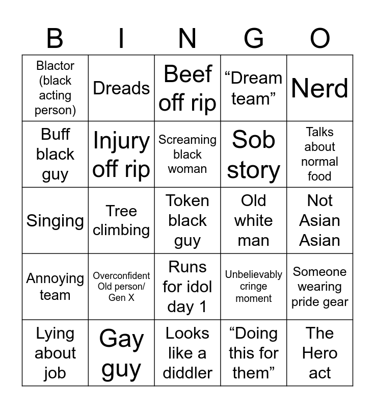 This bingo card has a free space and 24 words: Overconfident Old person/ Gen X, Gay guy, Screaming black woman, Lying about job, Nerd, Blactor (black acting person), Buff black guy, Dreads, Old white man, Runs for idol day 1, Sob story, Singing, Unbelievably cringe moment, Someone wearing pride gear, Injury off rip, “Doing this for them”, Not Asian Asian, Beef off rip, Talks about normal food, Tree climbing, The Hero act, Annoying team, “Dream team” and Looks like a diddler.