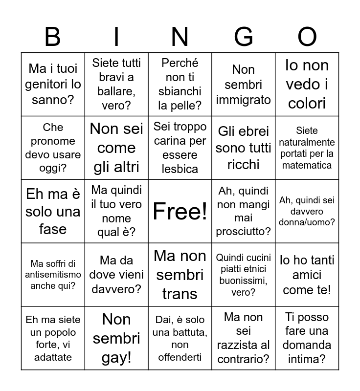This bingo card has a free space and 24 words: Ma da dove vieni davvero?, Non sembri gay!, Sei troppo carina per essere lesbica, Eh ma siete un popolo forte, vi adattate, Io non vedo i colori, Ma i tuoi genitori lo sanno?, Che pronome devo usare oggi?, Siete tutti bravi a ballare, vero?, Ah, quindi non mangi mai prosciutto?, Ma non sembri trans, Gli ebrei sono tutti ricchi, Eh ma è solo una fase, Quindi cucini piatti etnici buonissimi, vero?, Io ho tanti amici come te!, Non sei come gli altri, Ma non sei razzista al contrario?, Ah, quindi sei davvero donna/uomo?, Perché non ti sbianchi la pelle?, Siete naturalmente portati per la matematica, Ma quindi il tuo vero nome qual è?, Ti posso fare una domanda intima?, Ma soffri di antisemitismo anche qui?, Non sembri immigrato and Dai, è solo una battuta, non offenderti.