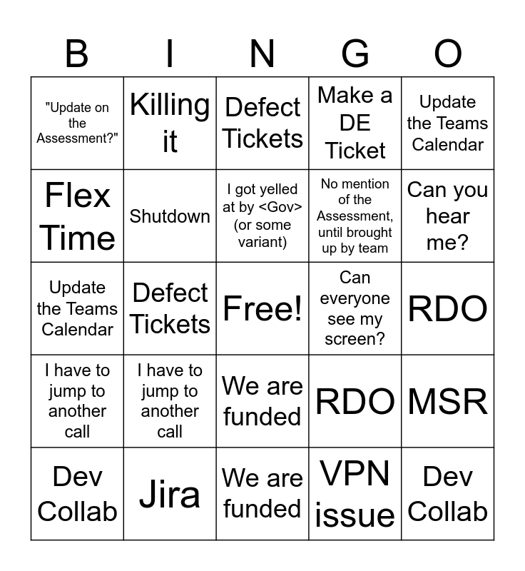This bingo card has a free space and 49 words: Can you hear me?, Dev Collab, Is Missy on here?, We are funded, I have to jump to another call, Mic Check, Killing it, Keep doing whatchu are doing., Flex Time, Jira, Shutdown, Make a DE Ticket, MSR, RDO, So (faded out) I can (unintelligible) by (cuts out) OK?, PTO Carry over, I got yelled at by <Gov> (or some variant), Can everyone see my screen?, DE is going to <Fill in blank>, Update the Teams Calendar, Defect Tickets, VPN issue, "Update on the Assessment?", No mention of the Assessment, until brought up by team, I'm Sorry, I was on mute, Can you hear me?, Dev Collab, Is Missy on here?, We are funded, I have to jump to another call, Mic Check, Killing it, Keep doing whatchu are doing., Flex Time, Jira, Shutdown, Make a DE Ticket, MSR, RDO, So (faded out) I can (unintelligible) by (cuts out) OK?, PTO Carry over, I got yelled at by <Gov> (or some variant), Can everyone see my screen?, DE is going to <Fill in blank>, Update the Teams Calendar, Defect Tickets, VPN issue, "Update on the Assessment?" and No mention of the Assessment, until brought up by team.