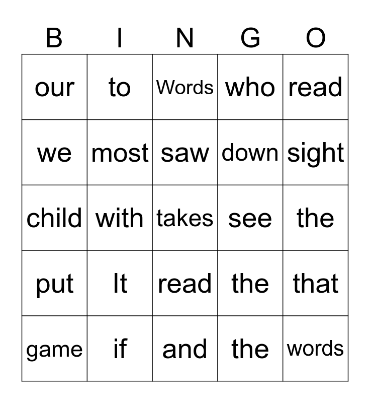 This bingo card has a free space and 30 words: They, if, Words, Bingo, read, our, most, saw, down, words, game, It, the, he, put, game, and, see, that, we, with, words, who, the, child, to, read, the, sight and words.