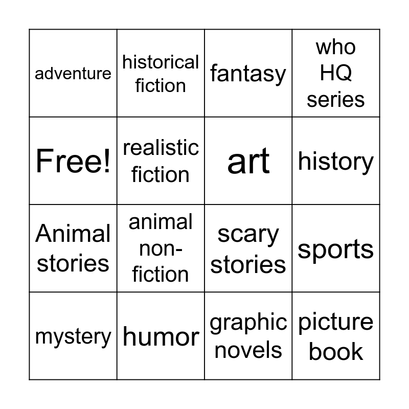 This bingo card has 16 words: humor, sports, fantasy, adventure, Animal stories, historical fiction, scary stories, graphic novels, Free!, realistic fiction, mystery, who HQ series, animal non-fiction, history, art and picture book.