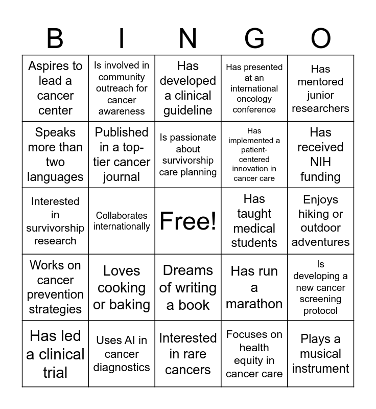 This bingo card has a free space and 29 words: Has led a clinical trial, Has a pet they adore, Collaborates internationally, Enjoys photography, Aspires to lead a cancer center, Has developed a clinical guideline, Published in a top-tier cancer journal, Loves cooking or baking, Has taught medical students, Uses AI in cancer diagnostics, Enjoys hiking or outdoor adventures, Plays a musical instrument, Interested in rare cancers, Focuses on health equity in cancer care, Has received NIH funding, Enjoys gardening, Dreams of writing a book, Works on cancer prevention strategies, Has mentored junior researchers, Interested in survivorship research, Has run a marathon, Presented at ASCO or AACR, Has implemented a patient-centered innovation in cancer care, Speaks more than two languages, Has presented at an international oncology conference, Is involved in community outreach for cancer awareness, Is developing a new cancer screening protocol, Is passionate about survivorship care planning and Is working on early detection methods for cancer.